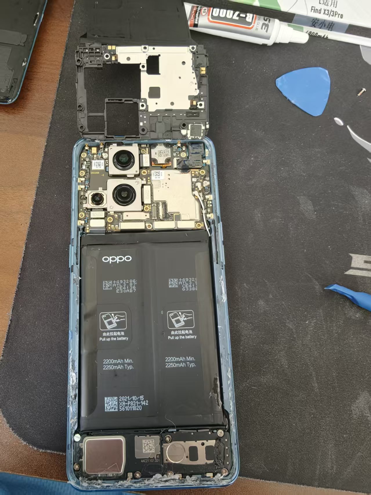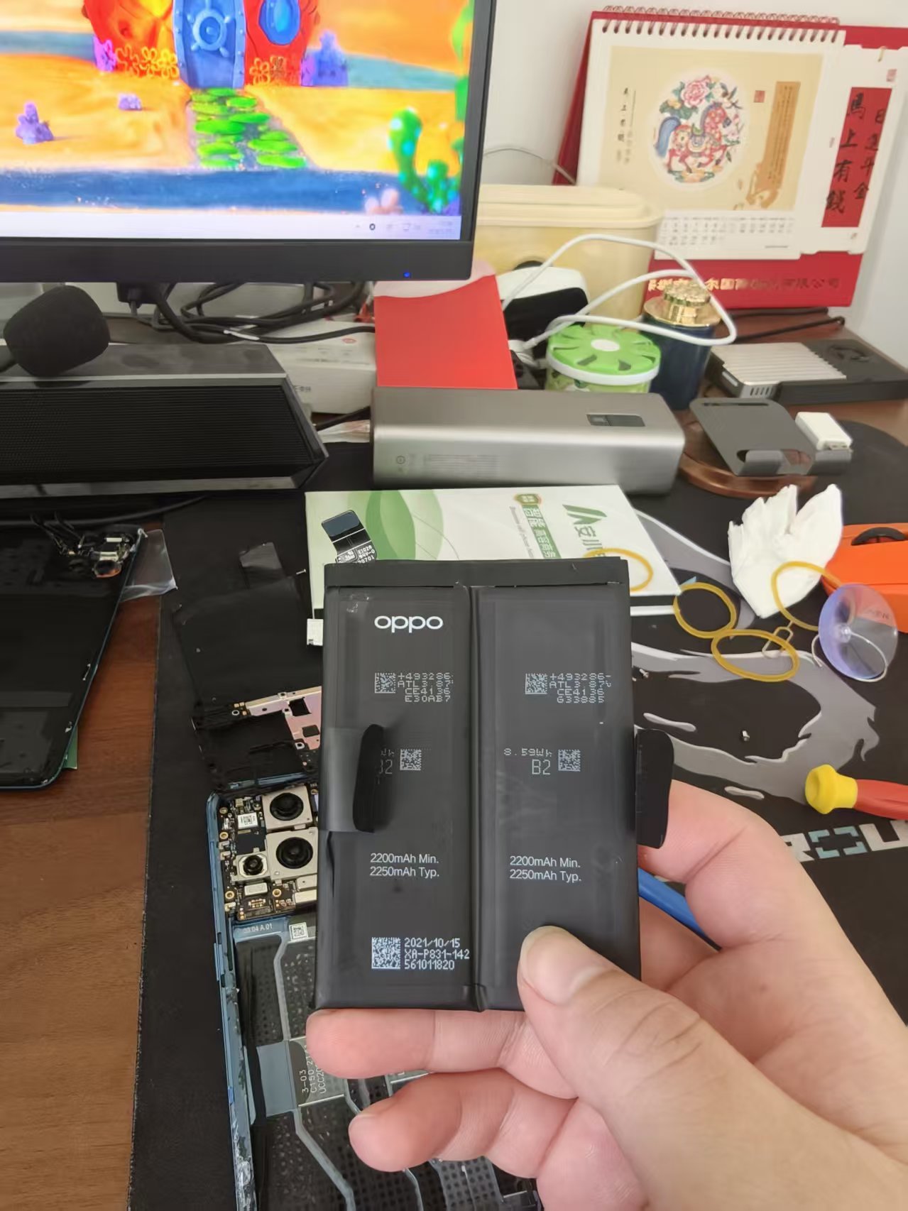 第四步:轻轻撬开电池排线(动作务必轻柔,避免损坏排线)。OPPO 机型的电池两侧配有易拉胶拉手,借助拉手就能轻松取下旧电池。